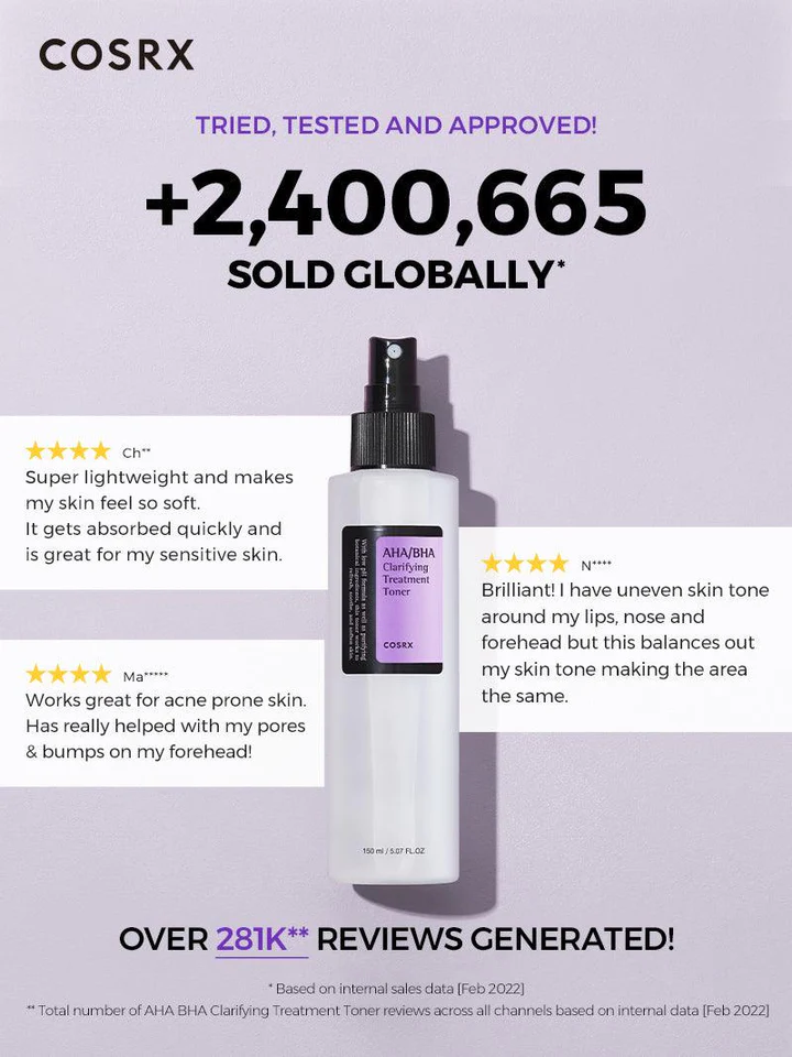 COSRX AHA/BHA Clarifying Treatment Toner’s lightweight consistency allows for quick absorption, prepping your skin to fully absorb subsequent skincare steps. Regular use reveals a smoother, clearer complexion that glows with youthful vitality.