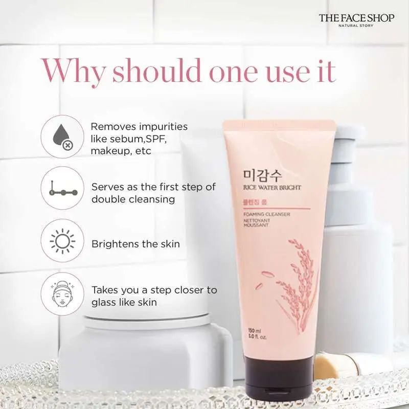 The Face Shop Rice Water Bright Foaming Cleanser is enriched with rice water extract, renowned for its gentle yet effective cleansing properties. It removes impurities, makeup, and excess oil, leaving your skin clean, clear, and revitalized.
